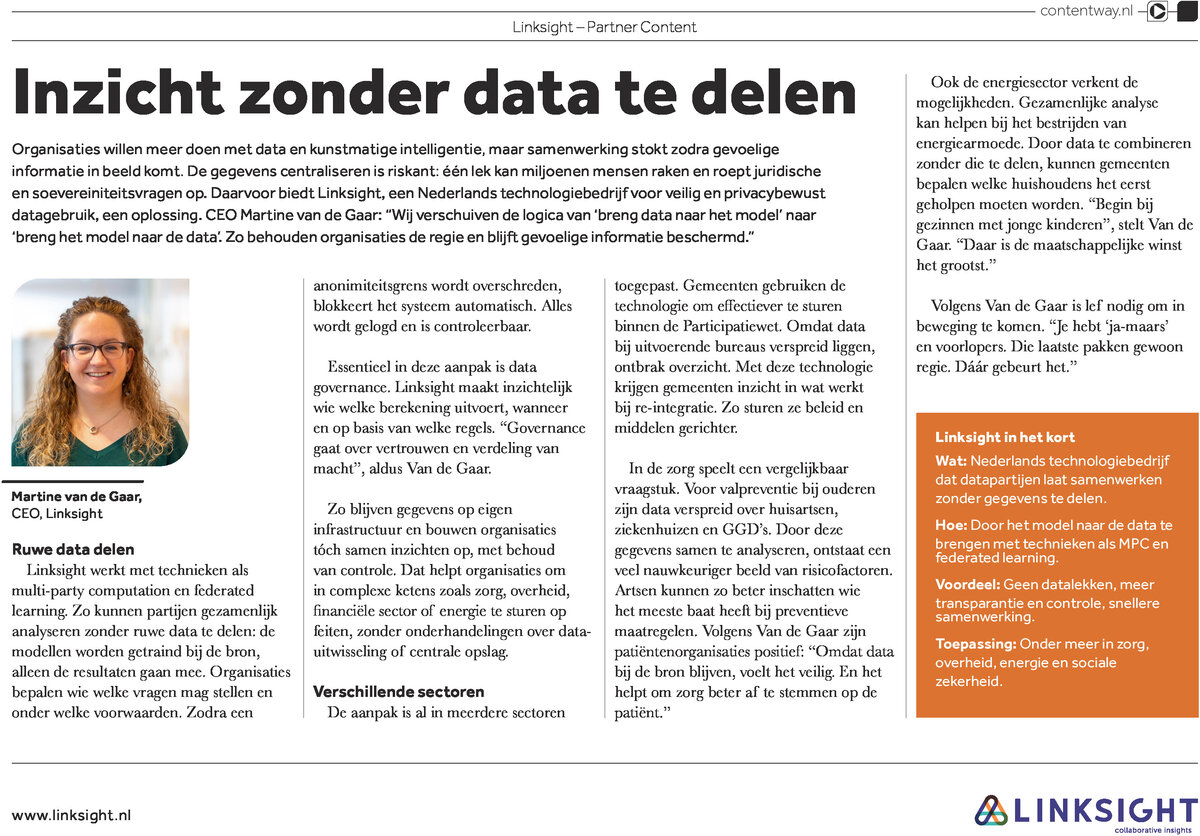 In a special supplement of the Dutch financial newspaper Het Financieele Dagblad on AI & Data Sovereignty, CEO Martine van de Gaar explains how Linksight helps organisations combine data without sharing it.